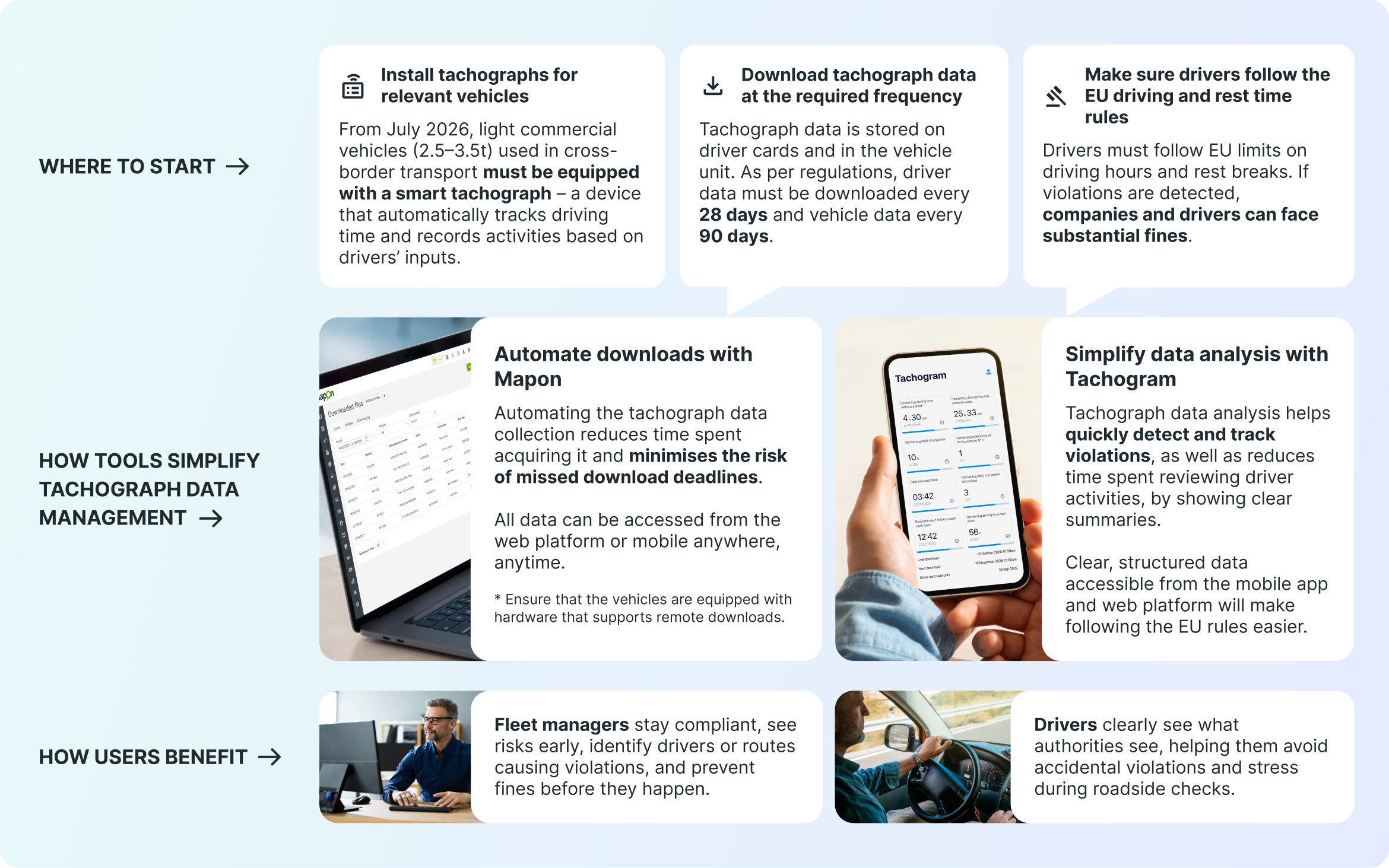LCVs used in cross-border freight transport must follow EU tachograph rules. Mapon and Tachogram help automate compliance – no manual downloads, no missed deadlines.