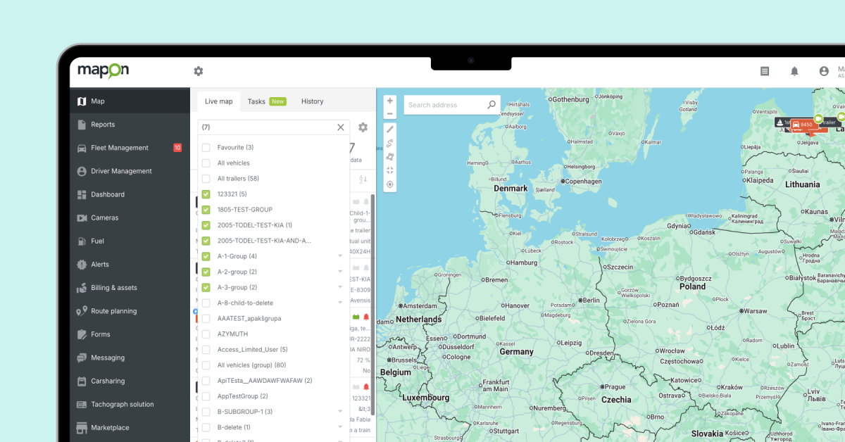 In the Map section, when filtering vehicles by group, you can now select multiple groups.
