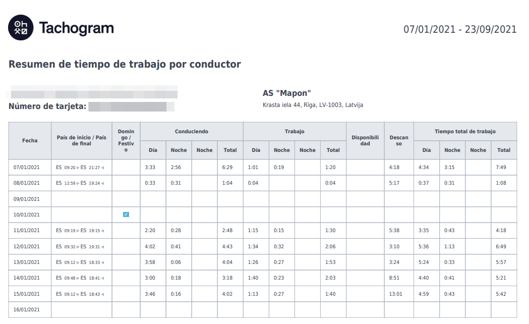 Las herramientas de análisis de tacógrafos digitales como Tachogram pueden ayudar a clasificar y comprender fácilmente todos los datos recogidos. Además, Tachogram ofrece un informe que resume las horas de trabajo de cada conductor y que está diseñado para mostrar exactamente cuándo empezó a trabajar, cuánto tiempo estuvo en la carretera, el tiempo del día que pasó conduciendo, los descansos que hizo y mucho más.