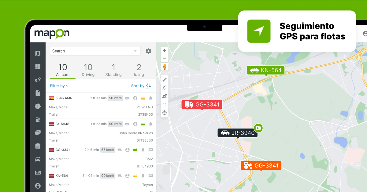 Una vista de la plataforma Mapon demostrando la solución de monitorización GPS.