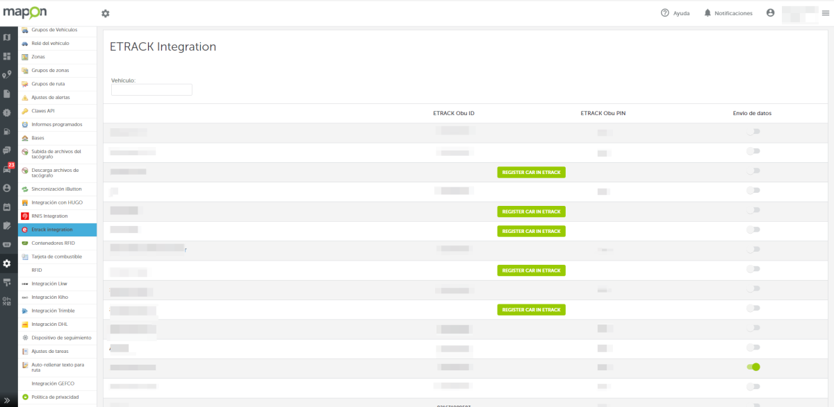 Para activar la integración, diríjase al menú de Ajustes en su cuenta de la plataforma Mapon. Allí, haga clic en la pestaña de integración de e-track. A continuación, haga clic en el botón REGISTRAR VEHÍCULO EN E-TRACK para los vehículos en los que desee activar la integración. Desde allí, puede activar o desactivar la transferencia de datos GPS con un interruptor al lado de cada vehículo. Consulte la guía completa para configurar la integración en estas instrucciones.