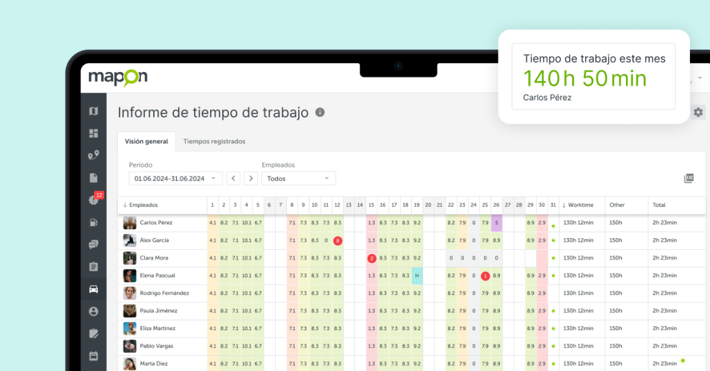 Captura de pantalla de la plataforma de Mapon con la herramienta de tiempo de trabajo