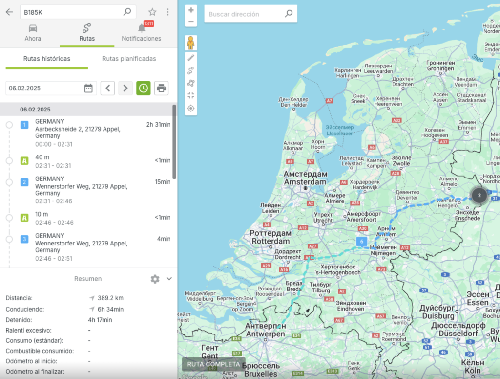 Vista de la plataforma de Mapon que muestra una ruta tomada por vehículos de la empresa, incluyendo información sobre la distancia recorrida, los tiempos de conducción y los tiempos deestacionamiento.