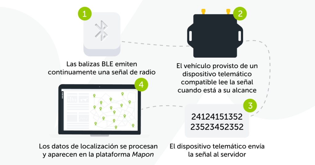 La plataforma de gestión de flotas Mapon ofrece distintos tipos de soluciones de seguimiento de activos, incluido el BLE. Las señales de un dispositivo BLE son captadas por un dispositivo de telemetría cercano, y la información se envía posteriormente a la plataforma Mapon, donde se muestra a los usuarios. Además, los administradores también pueden recibir notificaciones y ver información detallada del dispositivo BLE a través de la aplicación móvil Mapon.