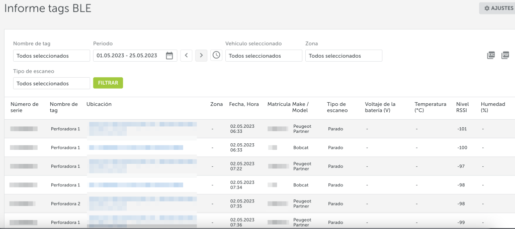 Informe que muestra el historial de captación de señales de las balizas BLE en la plataforma de Mapon