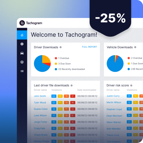 Obtén Tachogram y la solución de descarga remota del tacógrafo con un 25% de descuento, ¡solo 6 EUR por vehículo!