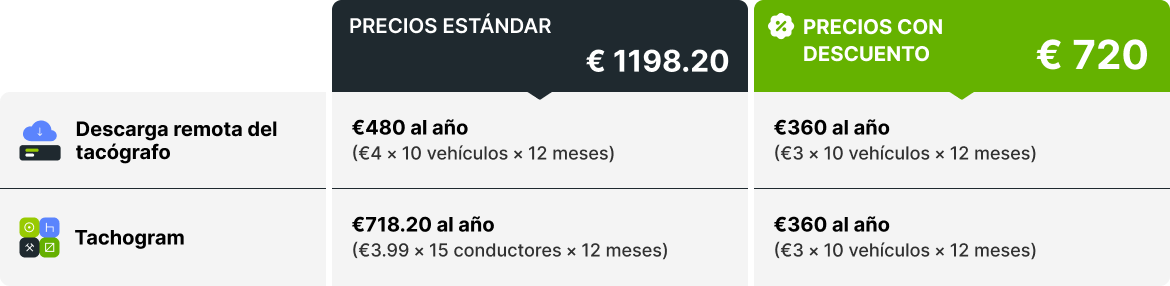 Para acceder a esta oferta, contacta con tu gestor de cuenta. Se aplicará la nueva tarifa al paquete de 3 € por vehículo por la descarga remota del tacógrafo y 3 € por vehículo por Tachogram.