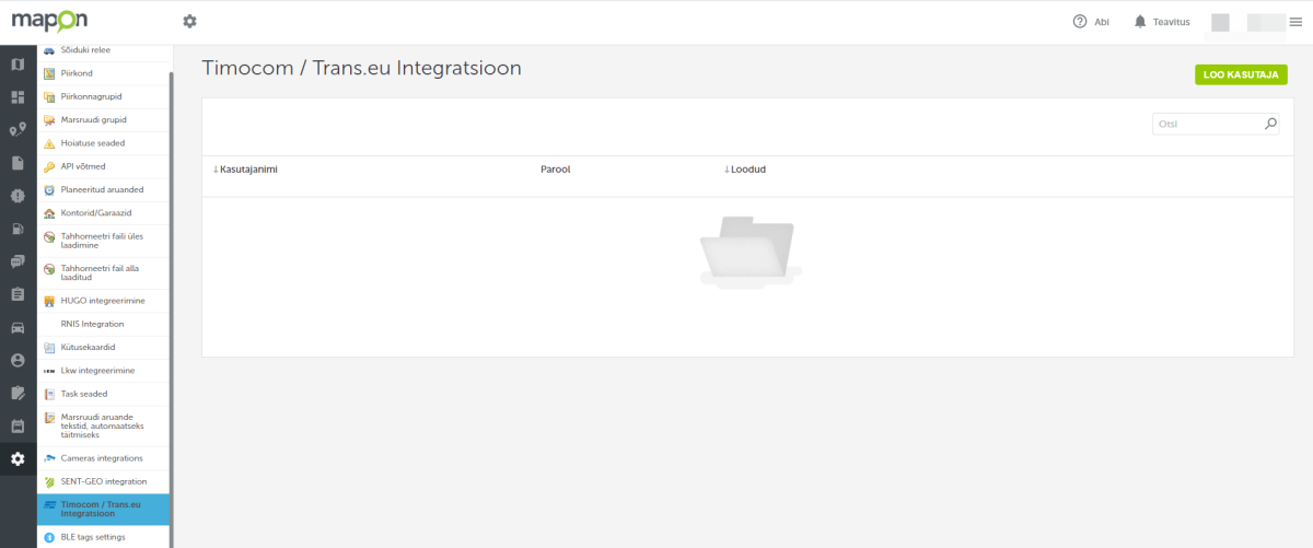 Maponi ja Trans.eu vahelise integratsiooni aktiveerimiseks logige esmalt Trans.eu platvormile sisse ja klõpsake nupule Transpordipark. Lisage sinna vähemalt üks sõiduk. Seejärel lisage Telemaatika osas teenusepakkuja, valides otsinguväljalt Maponi. Kui see on tehtud, sisenege Maponi platvormile ja liikuge Sätted osas vahekaardile Trans.eu integratsioon. Valige kasutajanimi ja salasõna ning kopeerige need andmed Trans.eu platvormil eelnevalt avatud telemaatika teenusepakkuja valikumenüüsse. Seejärel tuleb vaid sisse logida ja integratsiooni kasutama hakata. Vaadake käesolevas juhendis integratsiooni paigaldamise täielikku õpetust.