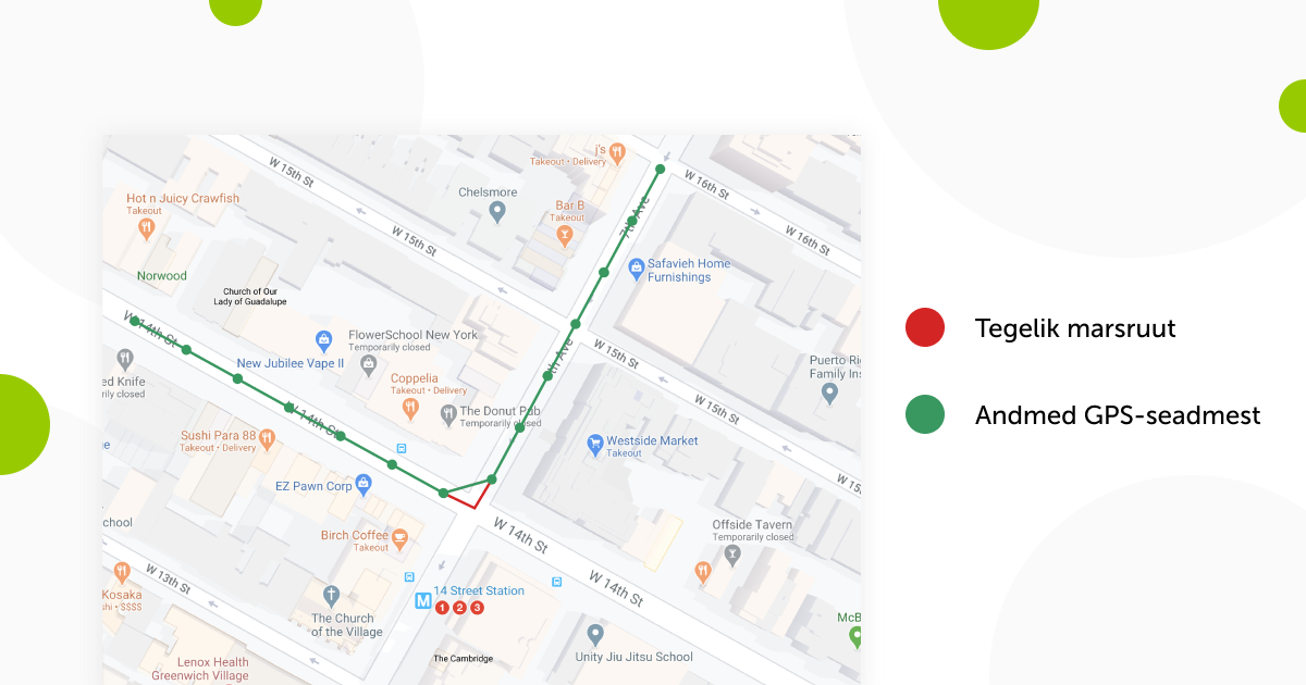 - asukohaandmete otsimise sagedus (mida sagedamini seade andmeid saadab, seda täpsem on läbisõit (vt allpool esitatud näidet));