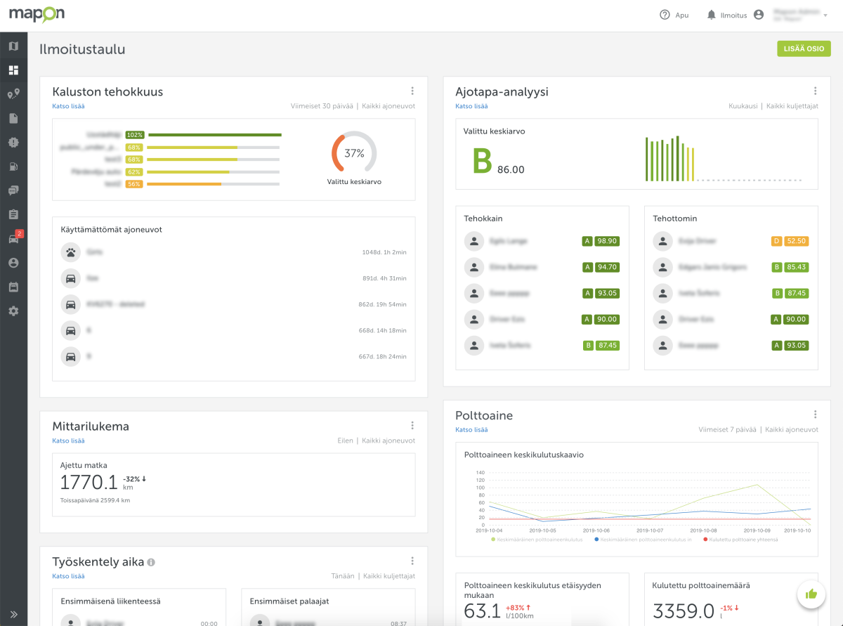 Ilmoitustaulu on luotu erityisesti sinulle, jotta saat nopean kuvan kalustosi suorituskyvystä sekä pystyt helposti tunnistamaan mahdolliset ongelmat.
