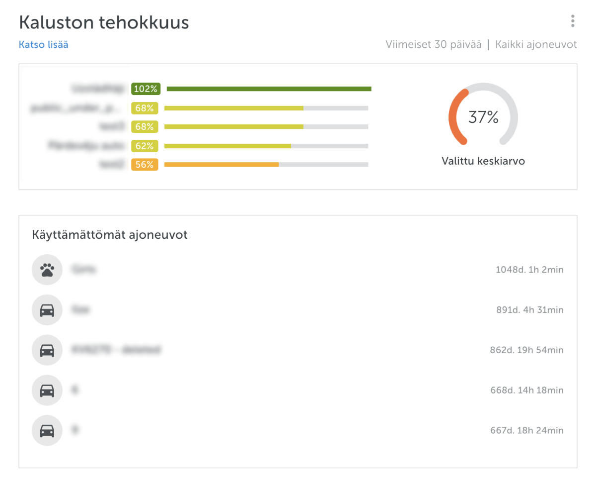 Kaluston tehokkuus on tilannekuva yrityksen kalustosta tiettynä päivänä. Ilmoitustaulun avulla tämä tieto on jaettu neljään moduuliin, jotka esittävät yleiskatsauksen kaikkien valitsemiesi ajoneuvoryhmien tehokkuudesta. Lisäksi näytetään TOP5 eniten- ja vähiten käytetyt ajoneuvot, sekä pisimpään käyttämättömänä olleet ajoneuvot (tämä lasketaan sytytysvirtatiedon perusteella).