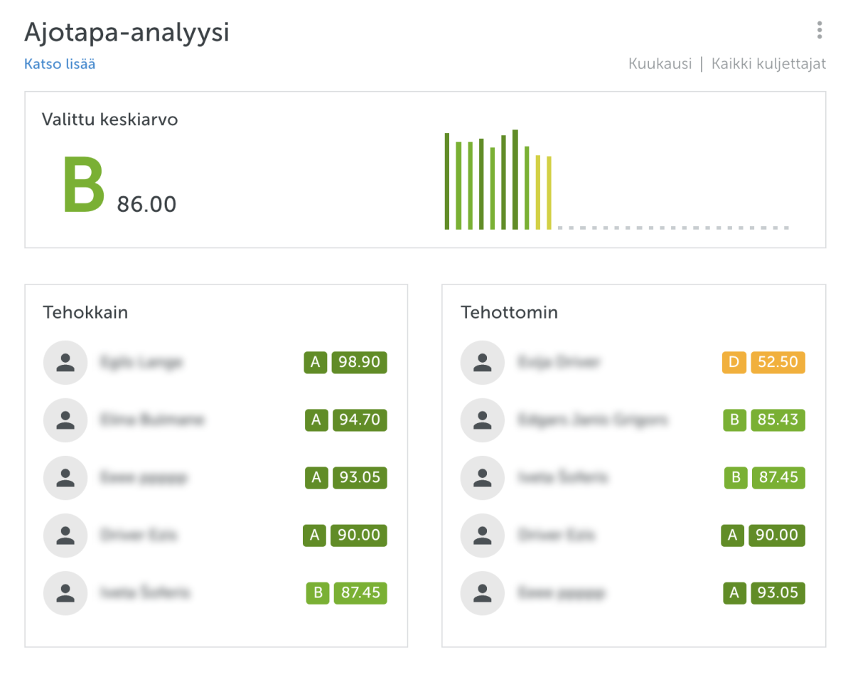 Tämä tietolohko koostuu kolmesta moduulista, joista näkee valittujen ajoneuvojen ja kuljettajien päiväkohtaiset, luokitusluokkapisteiden keskiarvot. Näet samalla myös viisi tehokkainta ja tehottominta ajoneuvoa sekä kuljettajaa.