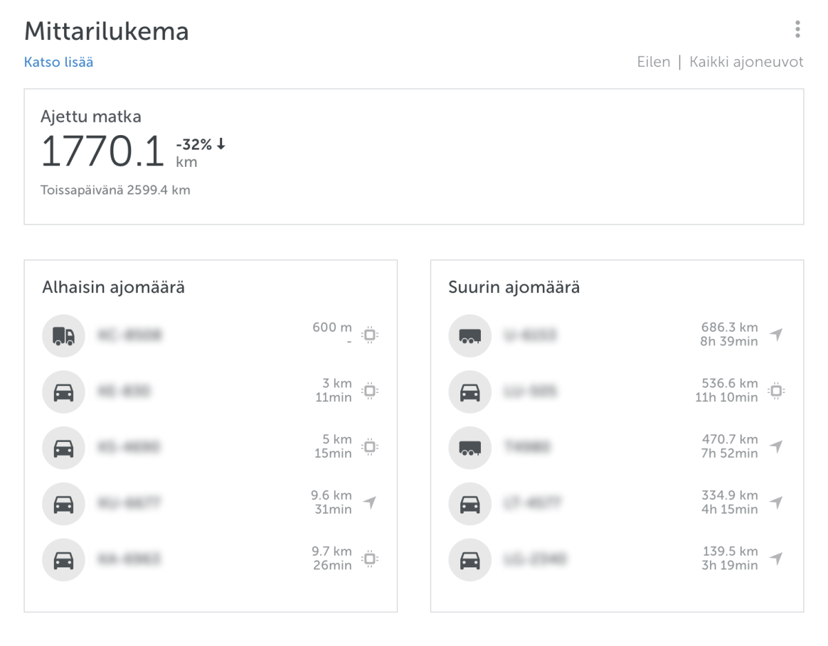 Myös tässä lohkossa on kolme moduulia, jotka näyttävät tiedot kokonaismatkasta kuluneena päivänä, kuten myös tiedot pisimmästä ja lyhyimmästä matkasta, jotka kalustosi ajoneuvot ovat ajaneet.