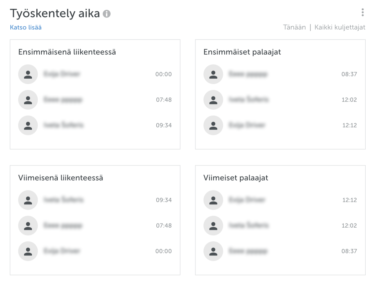 Tämän lohkon tarkoituksena on näyttää, milloin kuljettaja tai ajoneuvo on aloittanut ja lopettanut työnsä. Lohko koostuu kolmesta moduulista, jotka sisältävät tietoja varhaisimmista ja viimeisimmistä ajoista, jolloin työ alkoi ja päättyi. Lisäksi on saatavilla tietoa työajan ulkopuolella tapahtuvasta ajamisesta, mikäli Ajopäiväkirja-ratkaisumme on käytössä.