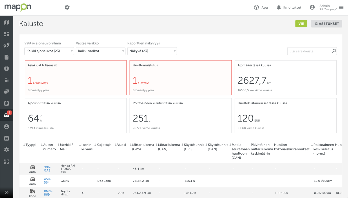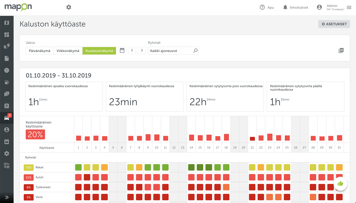 Kalustoa käytetään hyvin erilaisilla- ja erityyppisillä tavoilla, joten voi olla hyvin haastavaa tiedostaa, onko sinulla riittävästi, liian vähän vai liikaa ajoneuvoja. Kaluston käyttöasteen laskeminen on monimutkainen ja aikaa vievä prosessi, jos vielä osaa ajoneuvoista käytetään vain tiettyinä vuorokauden aikoina, ajossa tai kun ajoneuvo seisoo. Tämä ongelma voidaan helposti ratkaista käyttämällä automatisoitua kaluston käyttöasteen ratkaisua, joka tarjoaa yleiskuvan kalustosi tilasta tiettynä aikajaksona esim. päivä, viikko tai kuukausi. Sen avulla saat todellisen kokonaiskuvan, voit tehdä ajoissa tosiasioihin perustuvia päätöksiä tarvittavista kalustomuutoksista sekä säästää puhtaasti rahaa.