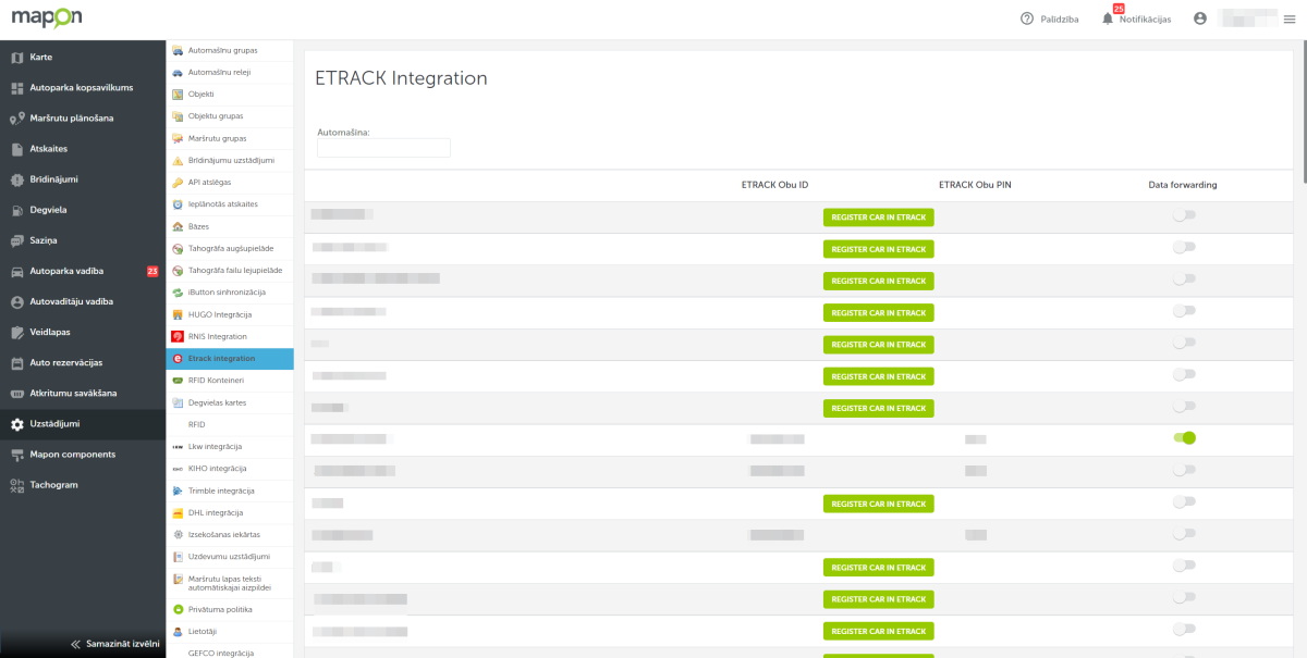 Lai aktivizētu integrāciju, dodies uz sava Mapon platformas konta izvēlni Iestatījumi. Tur noklikšķini uz e-track integrācija cilnes. Pēc tam noklikšķini uz REĢISTRĒT TRANSPORTLĪDZEKLI E-TRACK pogas tiem transportlīdzekļiem, kuriem vēlies aktivizēt integrāciju. No turienes tu vari ieslēgt vai izslēgt GPS datu pārsūtīšanu ar slēdzi blakus katram transportlīdzeklim. Uzzini, kā iestatīt integrāciju, šajā instrukcijā.