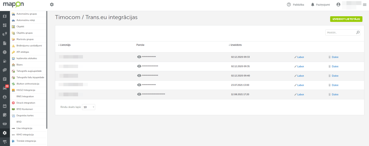 Lai iestatītu integrāciju, Trans.eu platformā dodies uz Fleet sadaļu. Ja vēl neesi to izdarījis, pievieno vismaz vienu transportlīdzekli. Tad pievieno pakalpojumu sniedzēju Telematics sadaļā, meklētājā izvēloties Mapon. Kad tas izdarīts, dodies uz Mapon platformu un iestatījumos atver Trans.eu integrācijas sadaļu. Izvēlies lietotājvārdu un paroli un iekopē tos jau atvērtajā Trans.eu Telematics sadaļā. Ja viss izdarīts pareizi, vari sākt izmantot integrācijas sniegtās priekšrocības. Pilno integrācijas pievienošanas instrukciju atradīsi šeit.