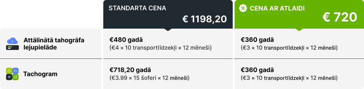 Piedāvājumu vari saņemt, sazinoties klientu menedžeri. Komplektam piemērosim piedāvājuma cenas – 3 EUR par transportlīdzekli par attālināto tahogrāfa lejupielādi un 3 EUR par transportlīdzekli par Tachogram.