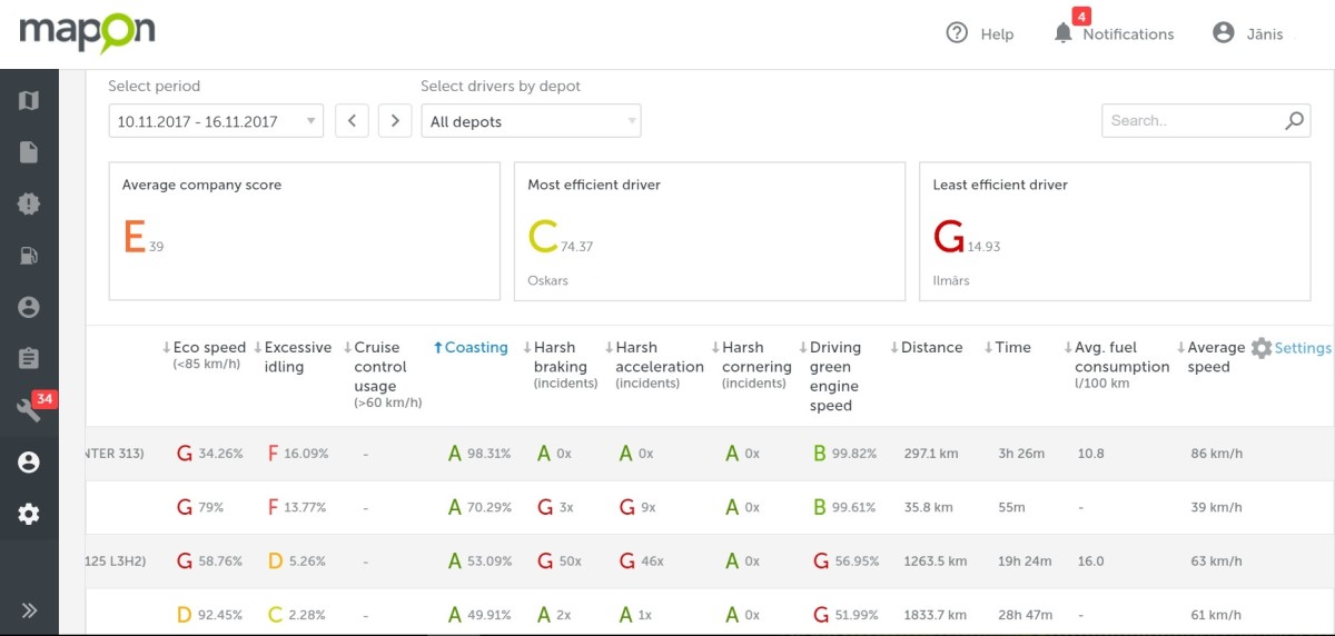 It is also excessive and also leads to increase in fuel consumption and maintenance costs, just like harsh acceleration and braking does. If a driver displays bad scores in all three of the aforementioned categories, it might be seen as a result of lack of rest, bad driving habits or bad choice of roads. In either case, it should be looked into.