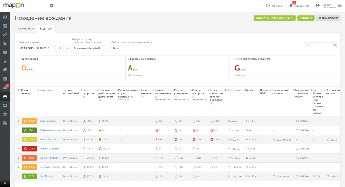 На основе этих параметров водителям присваивается рейтинг от A до G и создается подробный отчет, который позволяет определить положительные и рискованные привычки вождения каждого водителя.