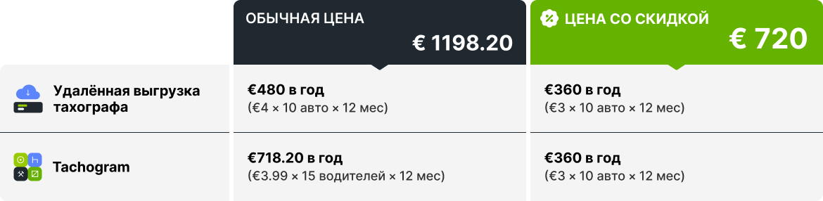 Получить предложение можно, связавшись со своим клиентским менеджером. Мы применим новую цену к пакету: 3 EUR за транспортное средство для удалённой загрузки тахографа и 3 EUR за транспортное средство для Tachogram.